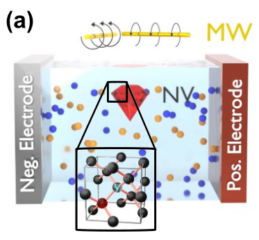 To use batteries as large-scale energy storage systems it is necessary to measure and understand their degradation in-situ and in-operando. As a battery’s degradation is often the result of molecular processes inside the electrolyte, a sensing platform which allows to measure the ions with a high spatial resolution is needed. In our publication by M. Hollendonner et al., we show that the electric field distribution generated by the ions inside the liquid electrolyte can be deduced by nanodiamonds equipped with NV-centers. This is the first step to determine the battery’s degradation while the battery is being operated.