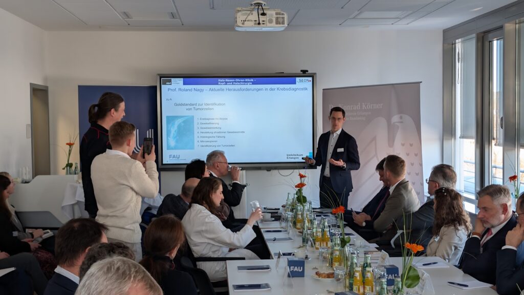 Prof. Alexiou, Head of SEON, Prof. Müller, Head of the ENT Department, and Prof. Nagy, Chair Holder of the Institute of Applied Quantum Technologies, presented ongoing research projects and technological developments to Minister Bär. The focus was on innovative approaches in nanomedicine as well as the use of quantum sensing in medical diagnostics and therapy.